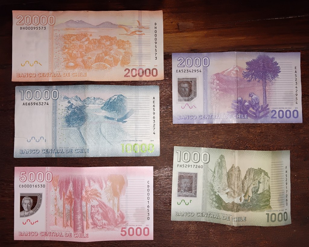 Ici on parle aussi espagnol, la monnaie c’est le pesos Chilien. 1 euro vaut 800 pesos Chilien, le billet le plus élevé est celui de 20 000 pesos l’équivalent de 23 euros.