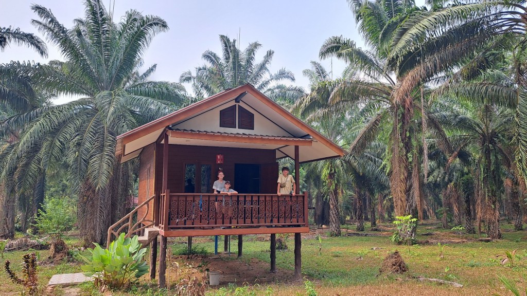 Sympa, on a dormi dans un bungalow sur pilotis au milieu d’une plantation de palmiers !