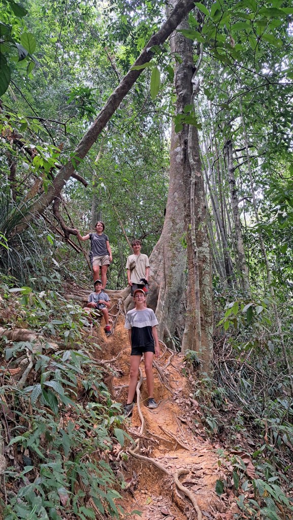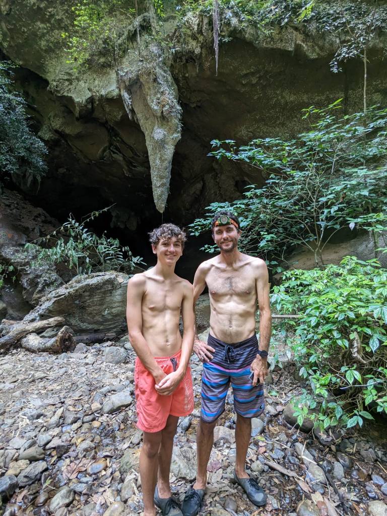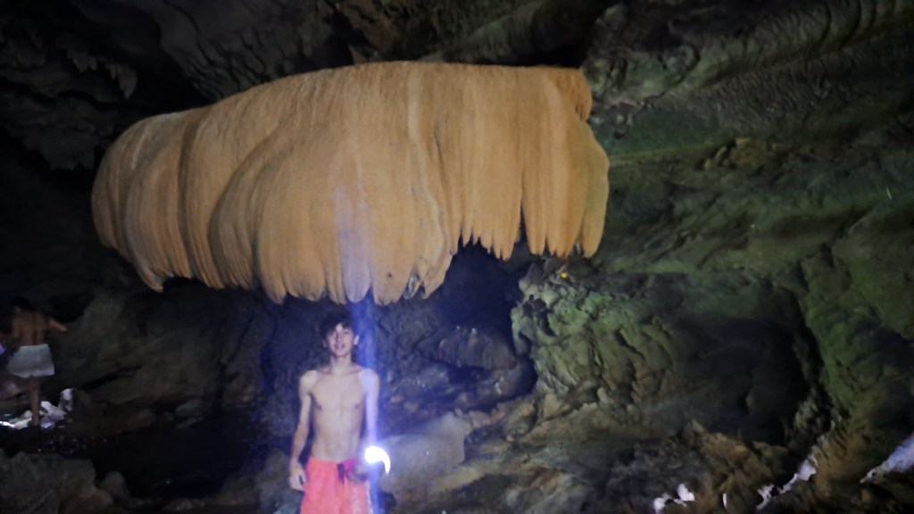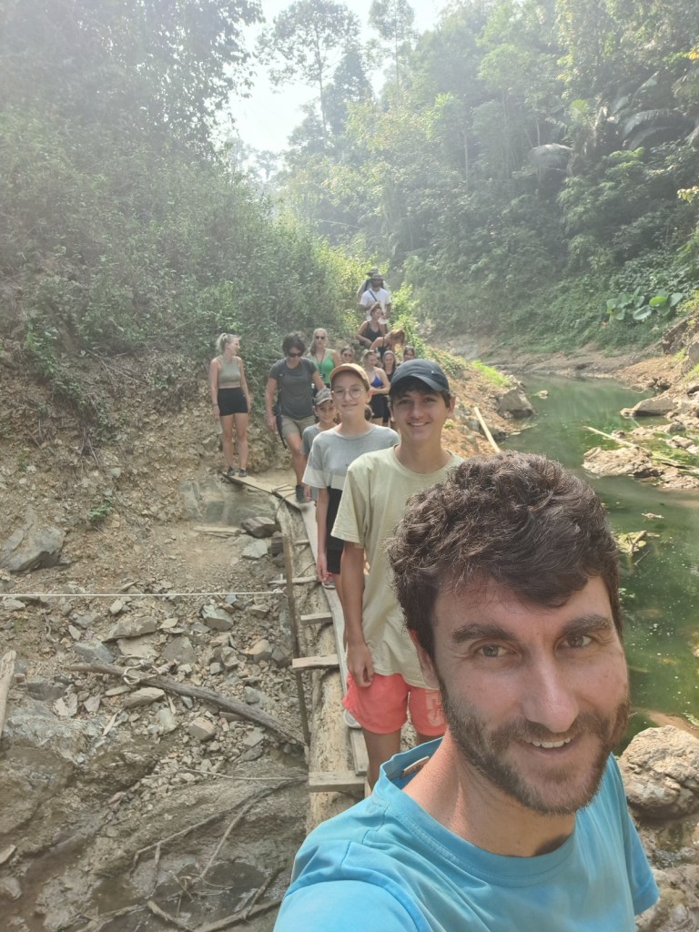 Et le lendemain nous sommes allés faire une marche en forêt. Guillaume et Malé ont même traversé une grotte équipés de lampes frontales où ils ont vu des chauves-souris et des araignées énormes 🫣. Ils ont dû également nager à plusieurs endroits. Albin, Tana et moi avons marché en dehors de la grotte. Ensuite il était déjà l’heure de déjeuner et de quitter notre maison sur l’eau 😪. Le trajet en bateau était magnifique. On a tous vraiment adoré cette expédition