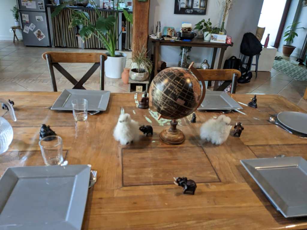 En 1er, la table était mise avec une déco type voyage, un globe terrestre au milieu.