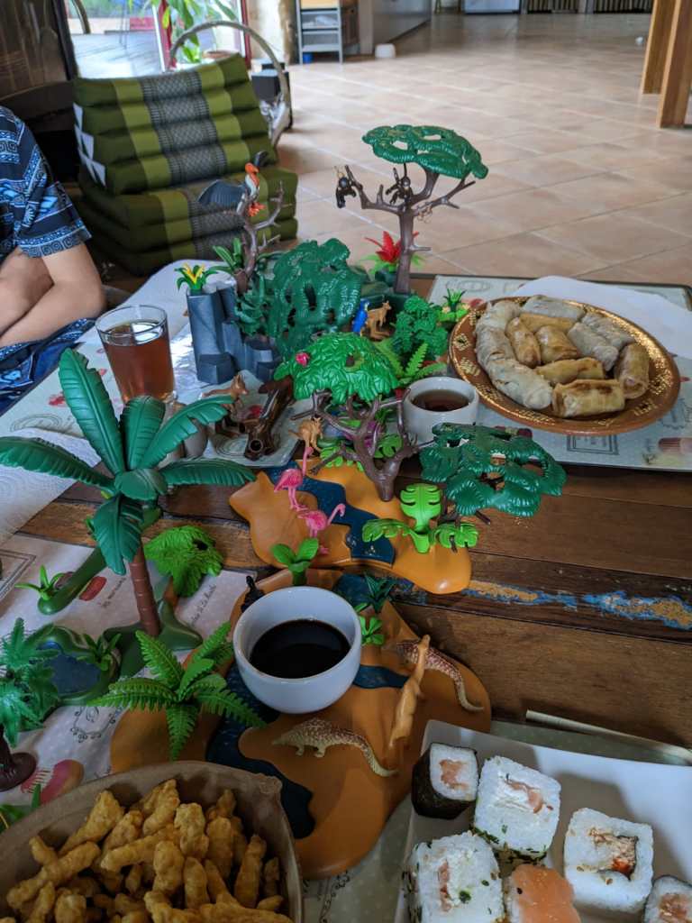 Puis la table d’apéro était elle, complètement décorée par Albin avec des playmobils d’animaux que nous avions croisés lors de notre voyage !  Il y avait même des fanions de fête 🎉🎊Génial.