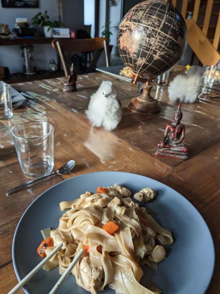 Et ce n’est pas fini, nous passons ensuite à table où Tana a préparé un plat asiatique : nouilles sautées au poulet gingembre et miel ! C’était TROP BON, une tuerie !!!