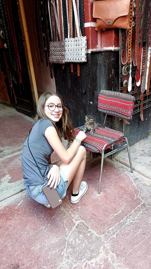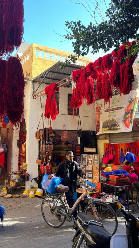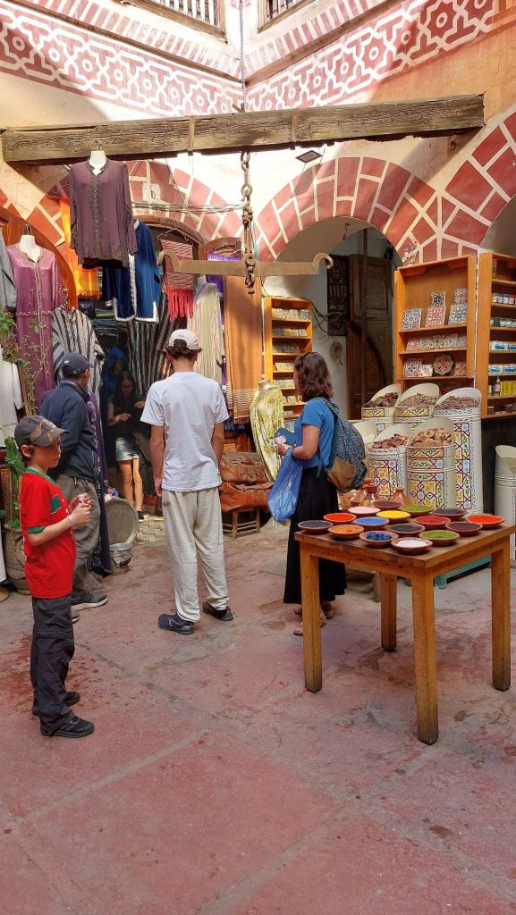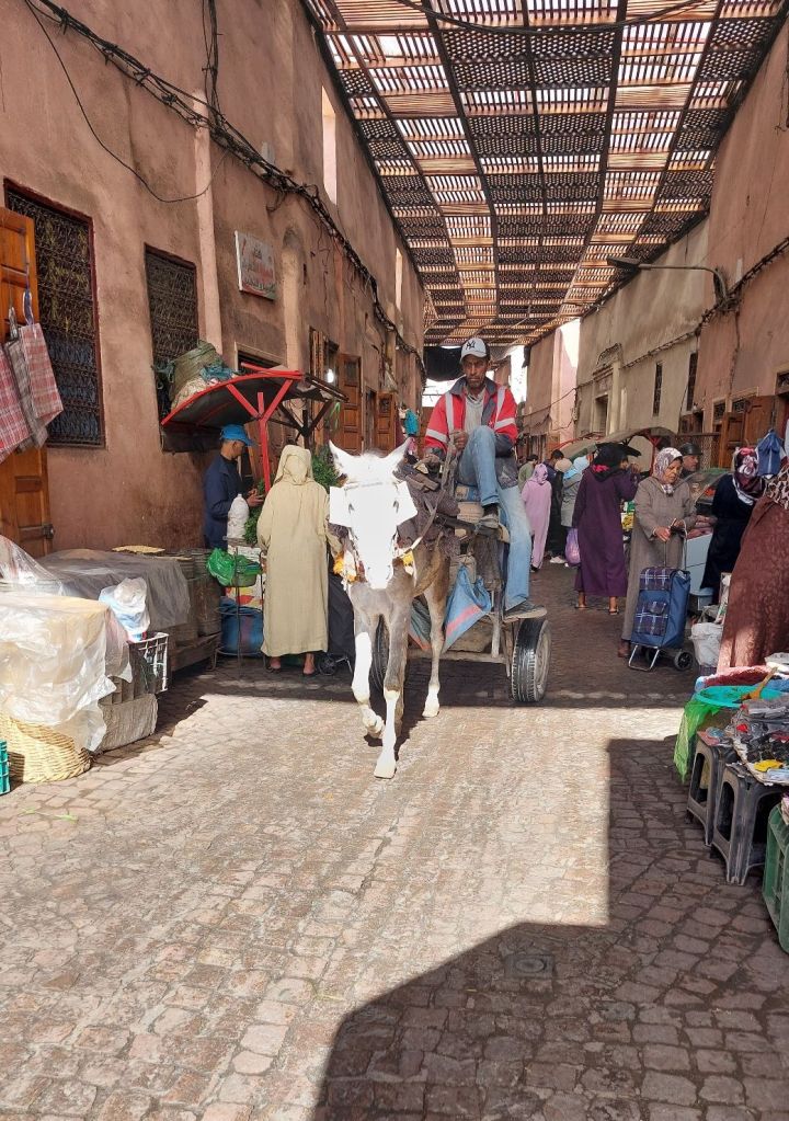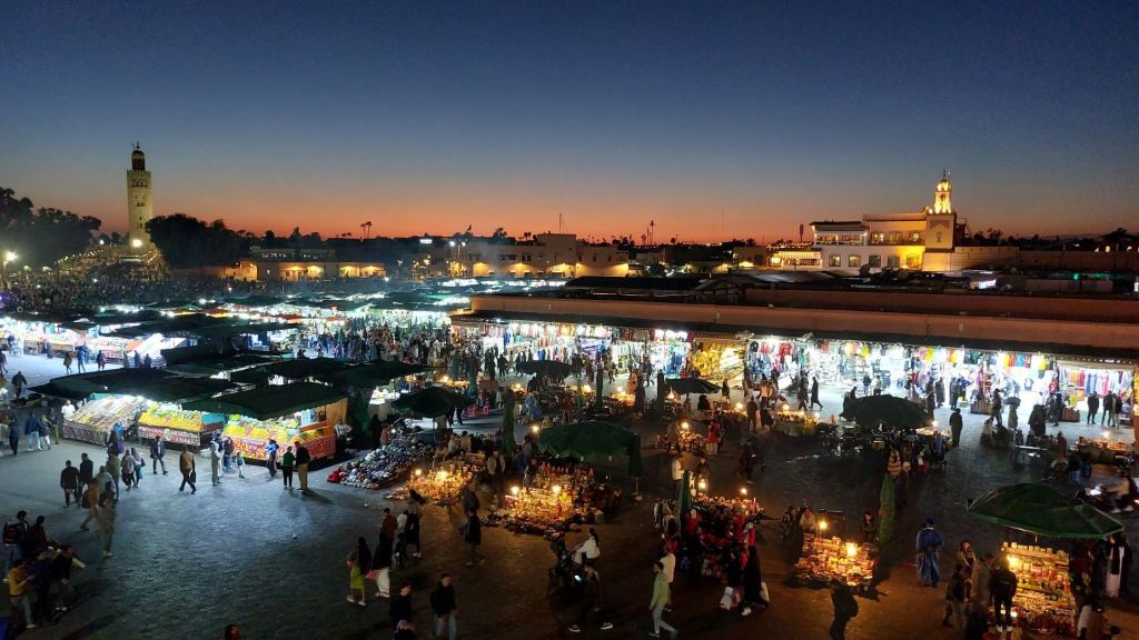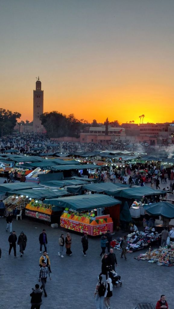 Après midi dans les souks, puis sur un rooftop au beau milieu des souks et enfin, le soir, on a trouvé un resto en terrasse avec vue sur la place Jema al fnaa avec superbe coucher de soleil