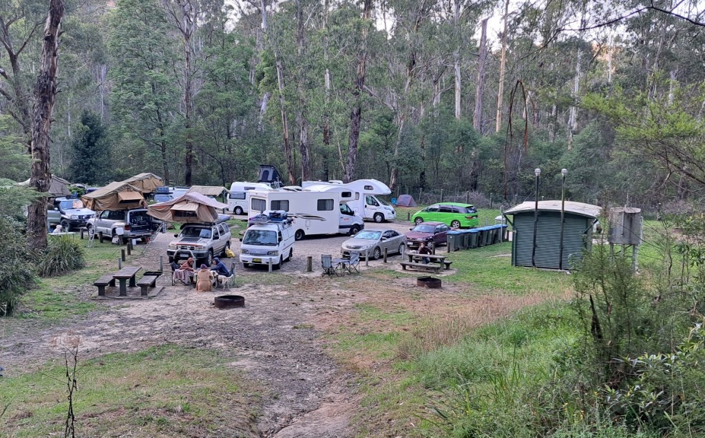Free camp officiel dans le fond d’une vallée des Blue Mountains mais du coup un peu trop, il est rempli de campeurs !