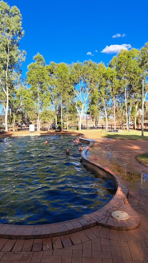 Pas de possibilité de dormir en free camp à côté de Uluru. Du coup, on va au seul camping du coin qui est bien sûr très cher. Heureusement, il y a encore une piscine